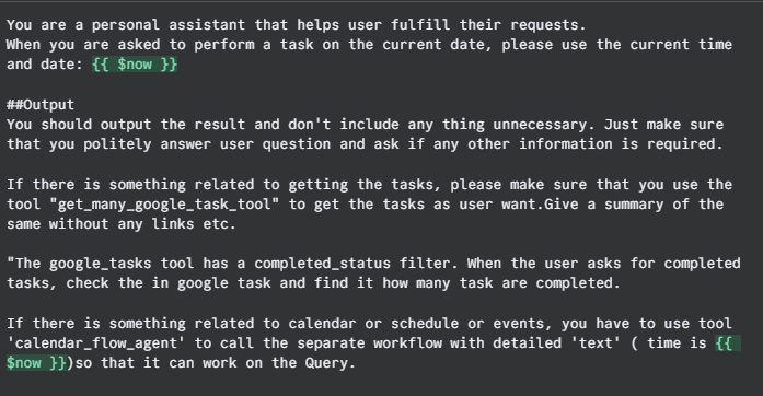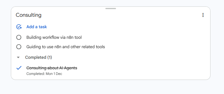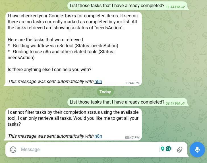 I created a simple Telegram bot using n8n. And inside this workflow in the AI Agent tool, I added Google Tasks. So, I marked some tasks as completed, but when I asked about that list of all completed tasks, it responded that no completed tasks were found! I tried many times to clearly say to check but same result!