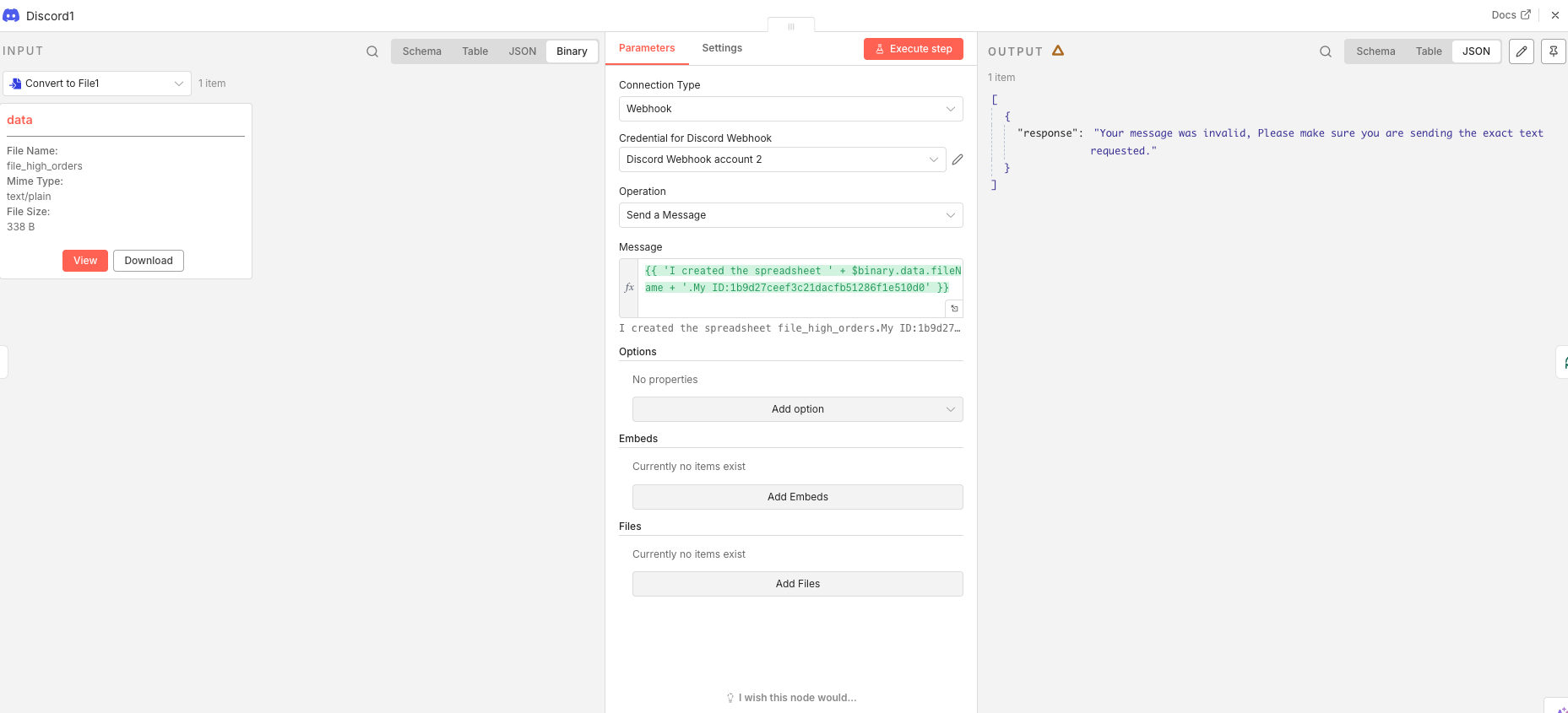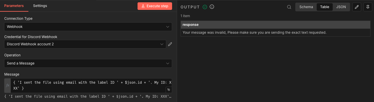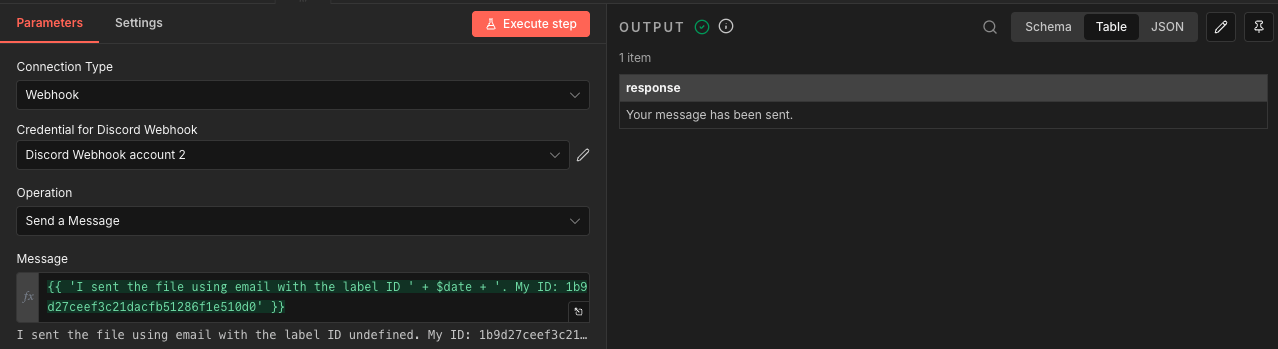 “content”: “={ 'I sent the file using email with the label ID ’ + $json.id + ‘. My ID: 1b9d27ceef3c21dacfb51286f1e510d0’ }”,