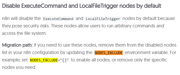 In n8n v2.x, the Execute Command node is disabled by default for security,