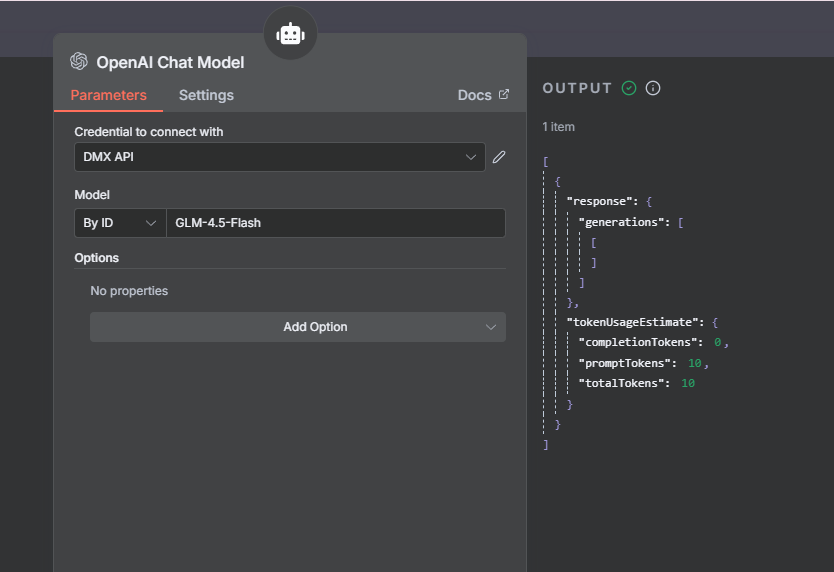 In N8N, I used the AI Agent to call the DMX API integration model. It showed a successful connection, but when inputting content to the large model, it only returned the error: “Problem in node ‘AI Agent’. Cannot read properties of undefined (reading ‘message’)”. However, connecting to other official large model APIs does not exhibit this issue.