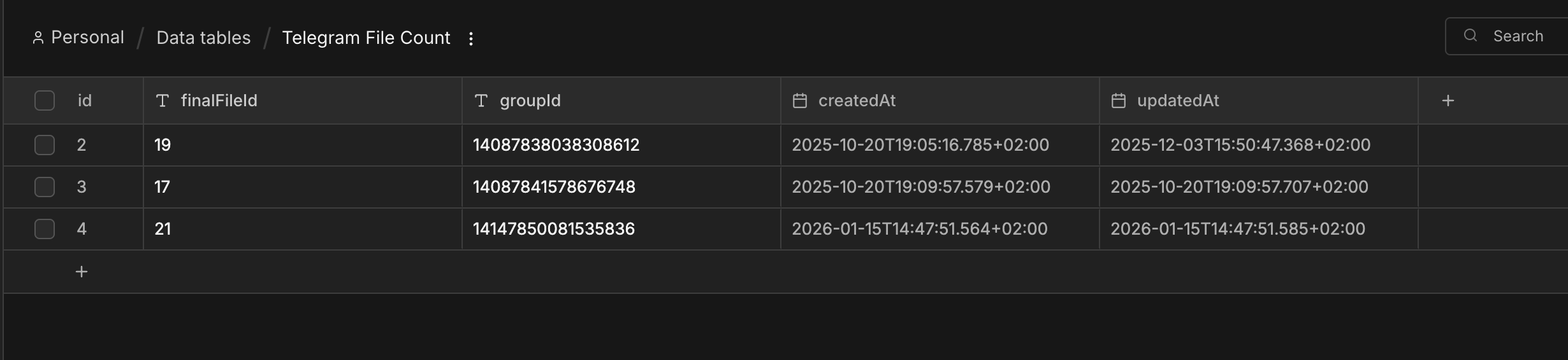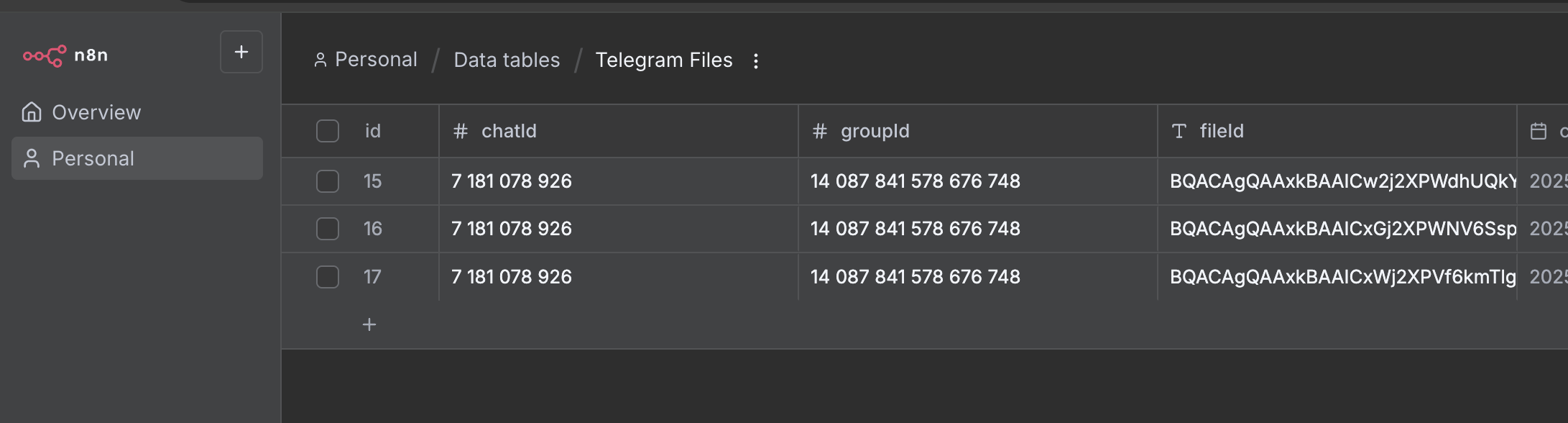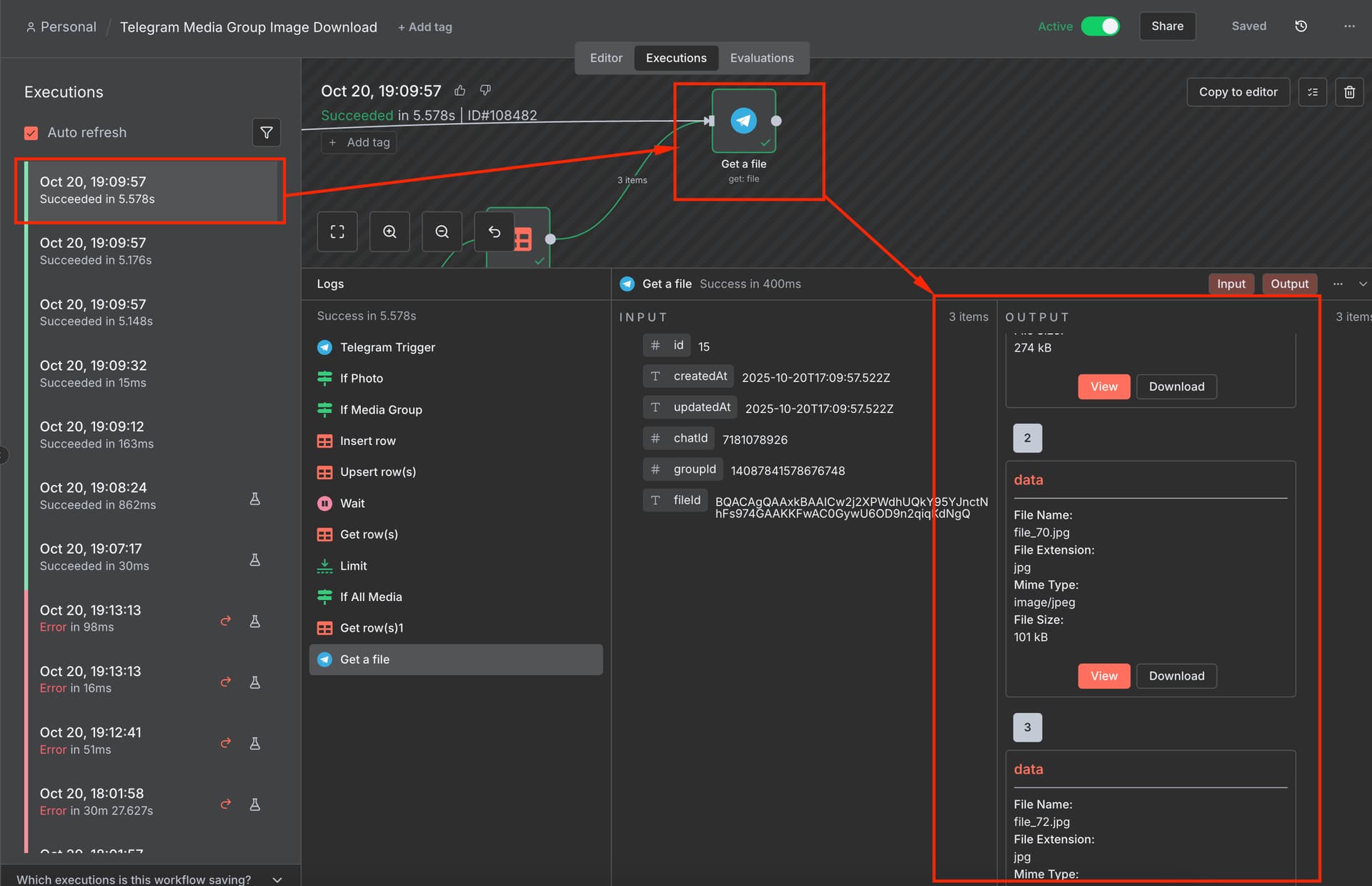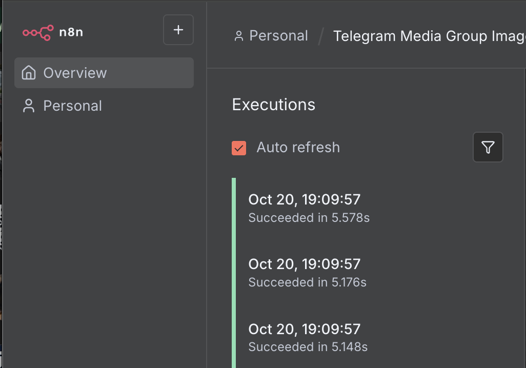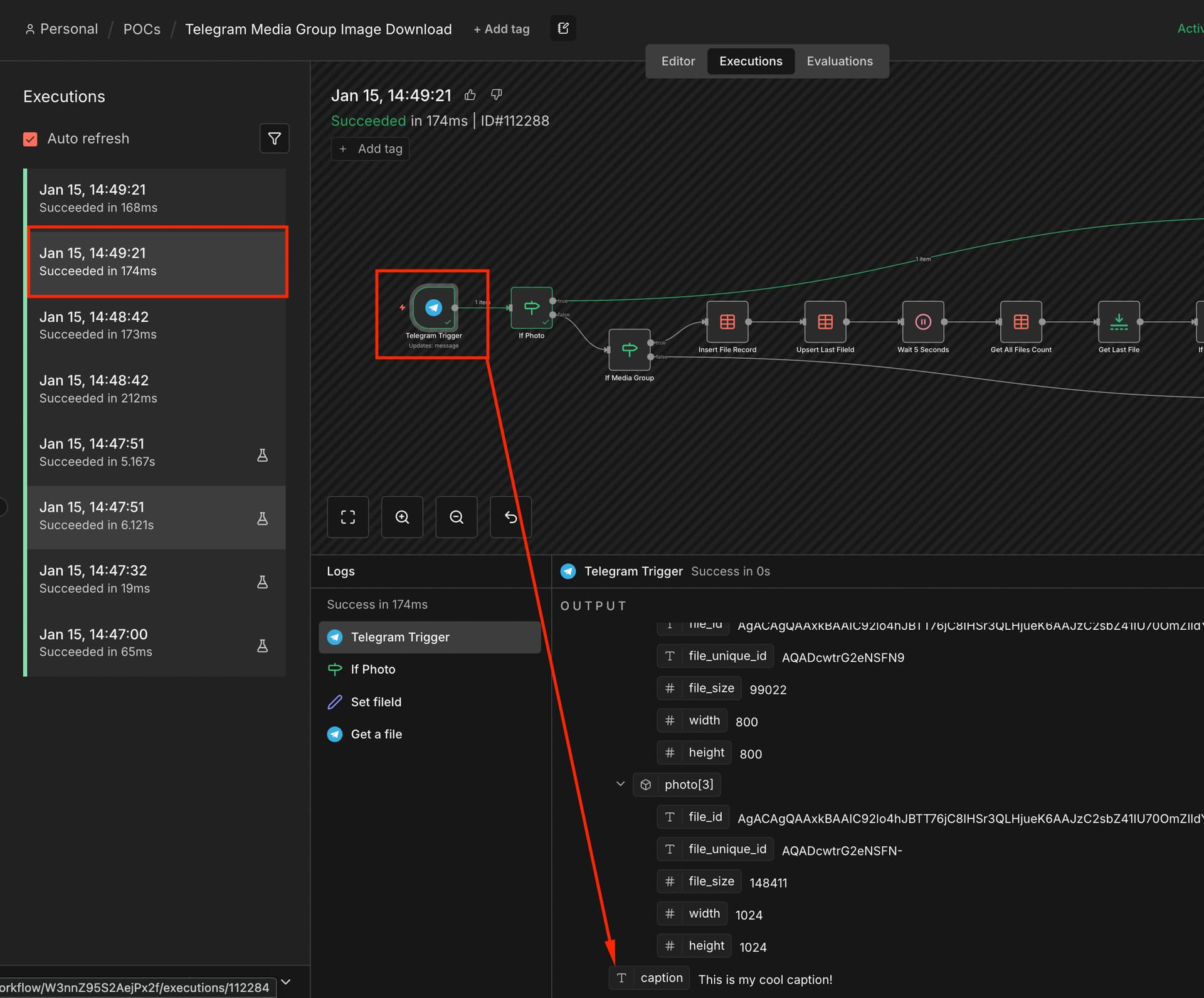 So I sent a message with 3 photos attached. As you can see there were 3 workflow executions, each writing a record to a data table for the chat, media_group_id and file_id. Only the last execution will actually go on to download all files and process them