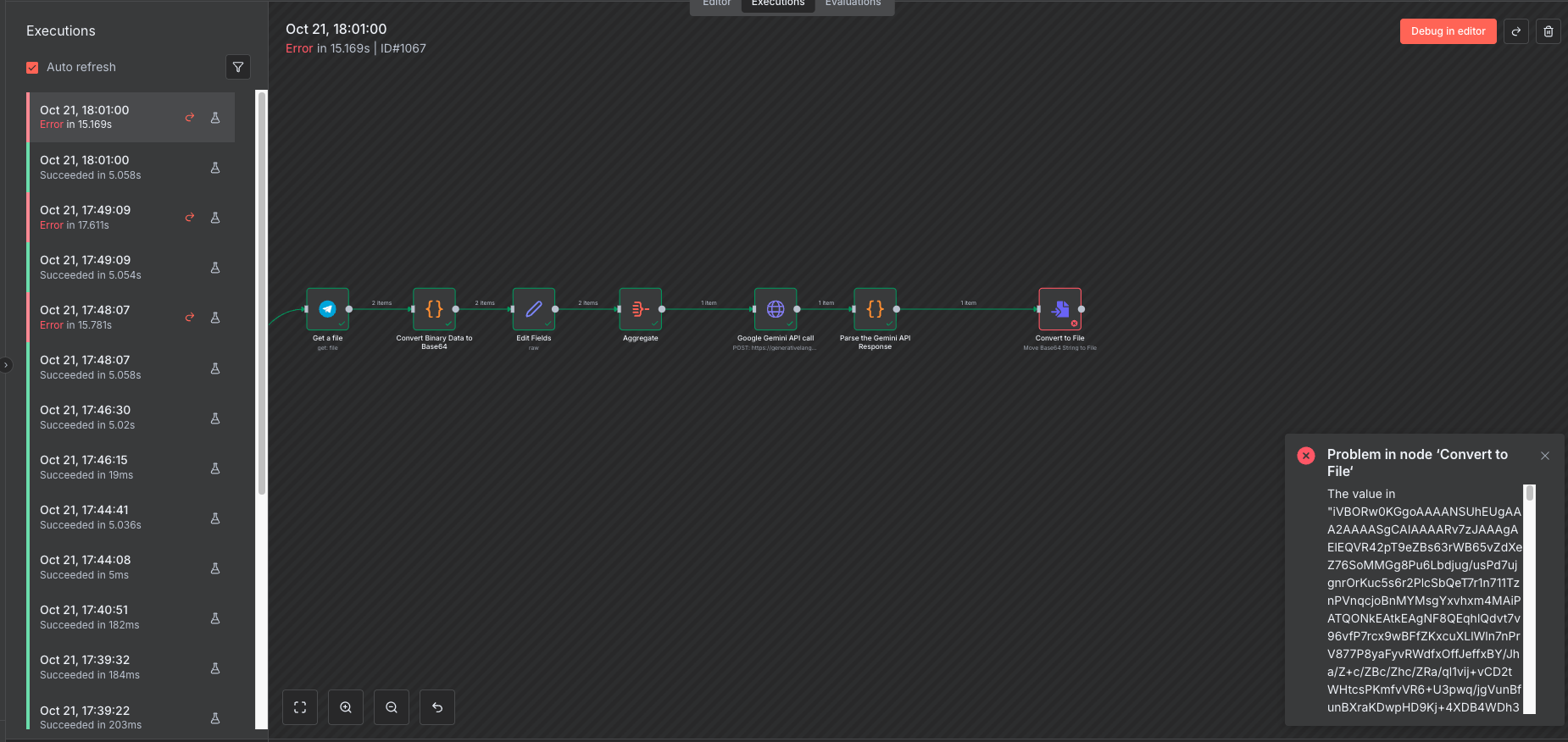 Just to close this off, based on our call now, you just had to map out the data from the Gemini response so the base64 to file node could look at the correct data.