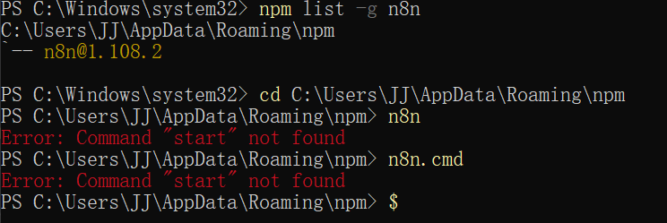 bash cd C:\Users\JJ\AppData\Roaming\npm\node_modules\n8n node bin\n8n
