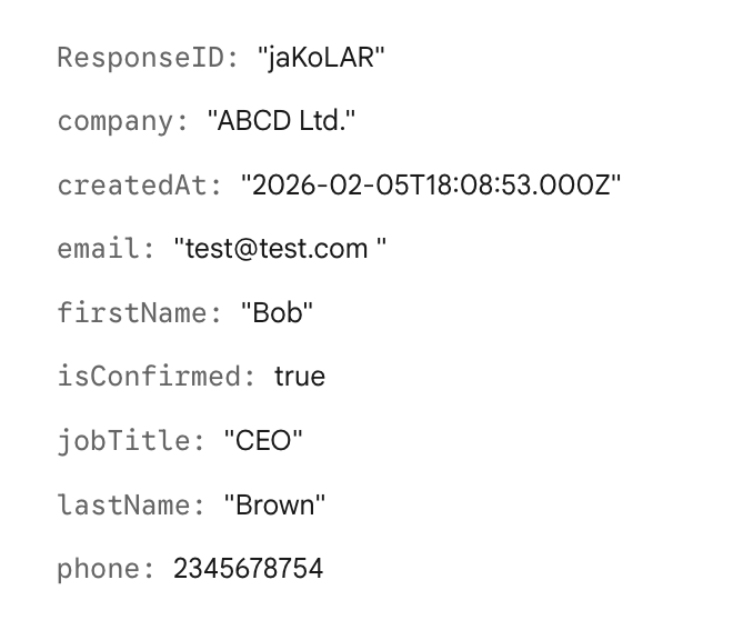 Copy and paste this exactly:ResponseID, firstName, isConfirmed, Turnover, company, createdAt, email, jobTitle, lastName, phone