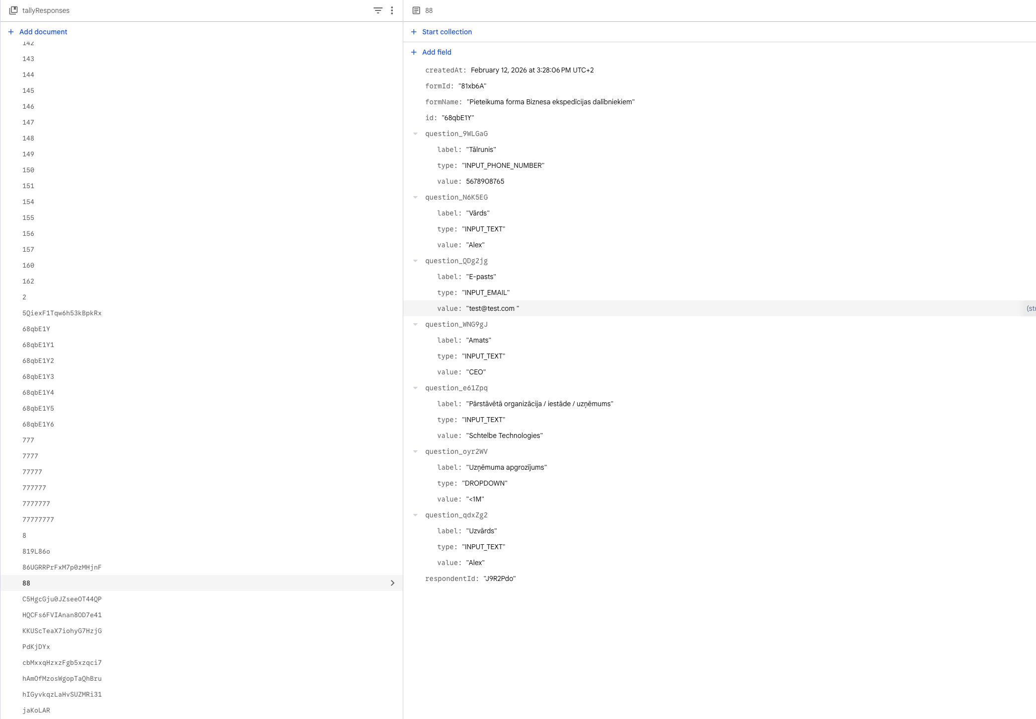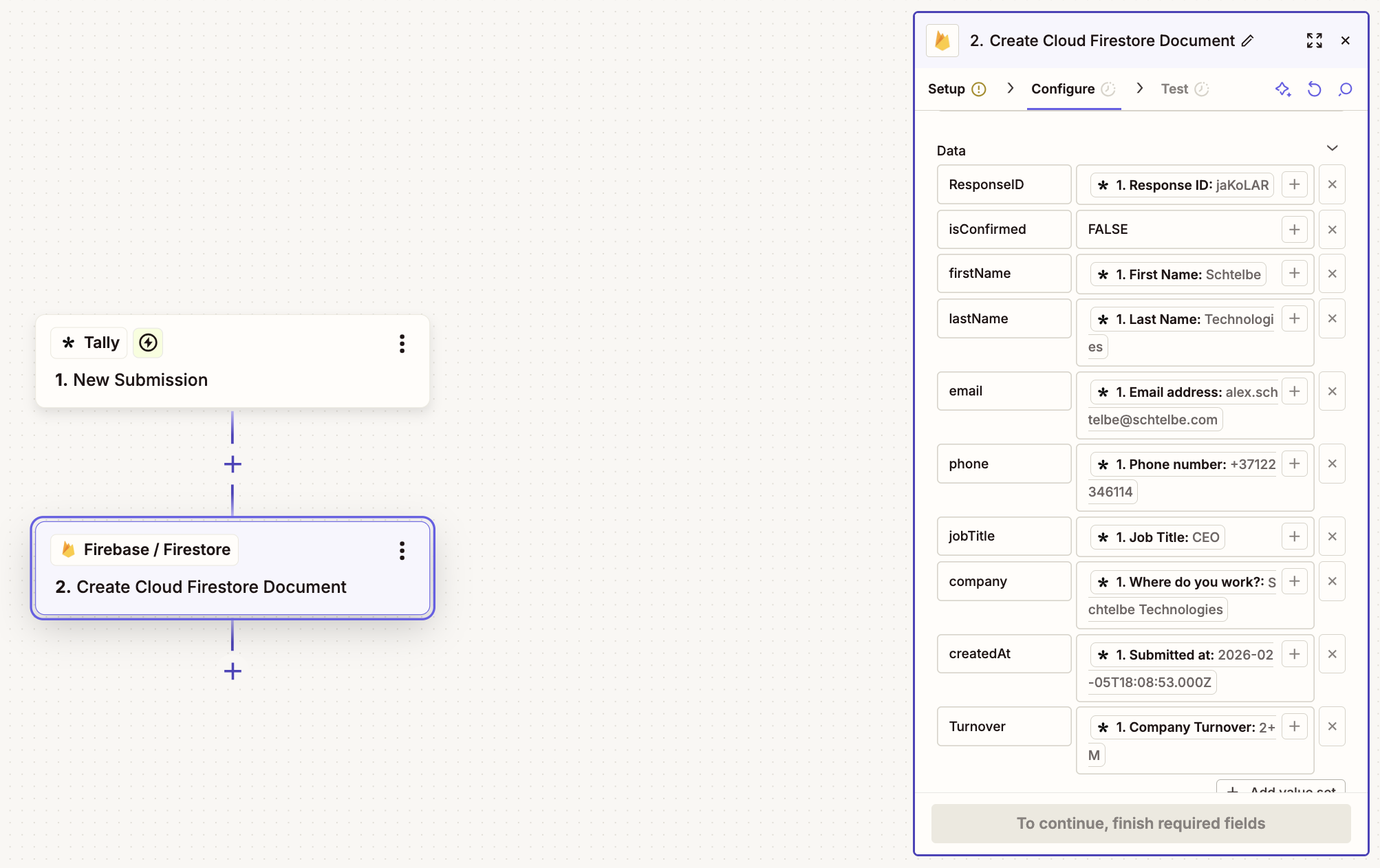 try inserting an Edit Fields node between your Tally Trigger and the Firestore node. Create the clean fields you want on the left, and drag the specific values you need from the Tally output on the right.