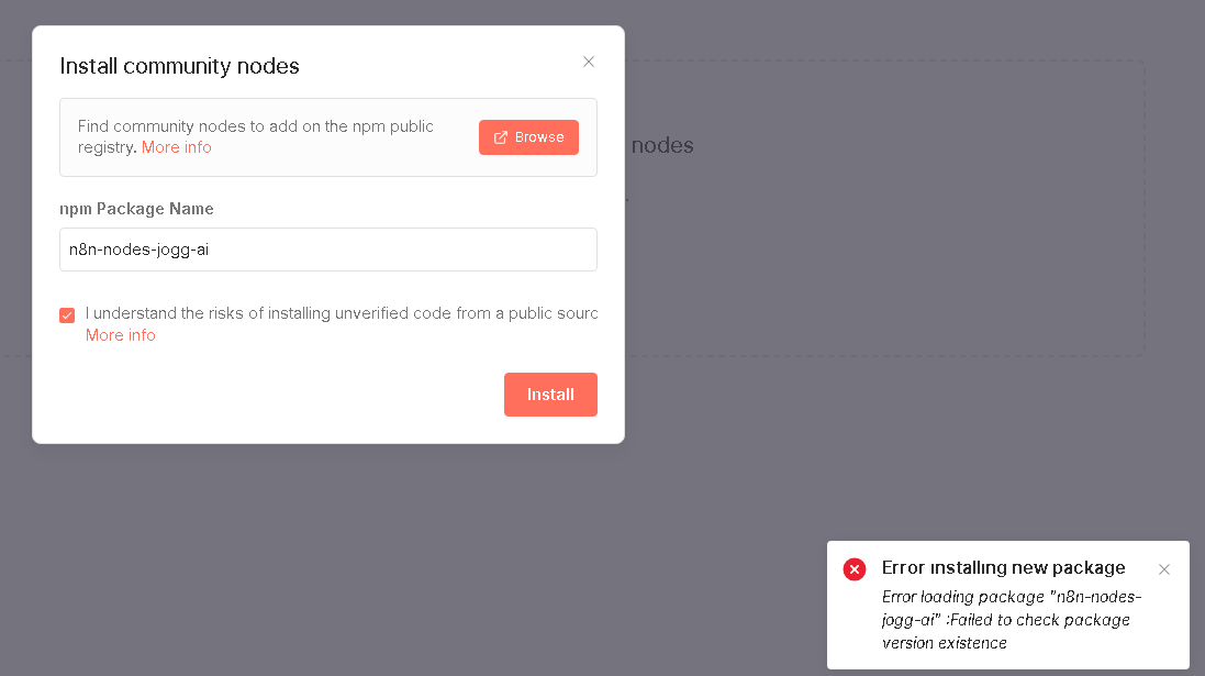 Error loading package “n8n-nodes-jogg-ai” :Failed to check package version existence