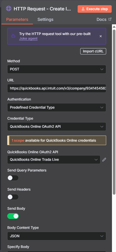 - Lastly, the final node, my QuickBooks Online node that is to create the invoice. At first I thought I was supposed to do it like this: