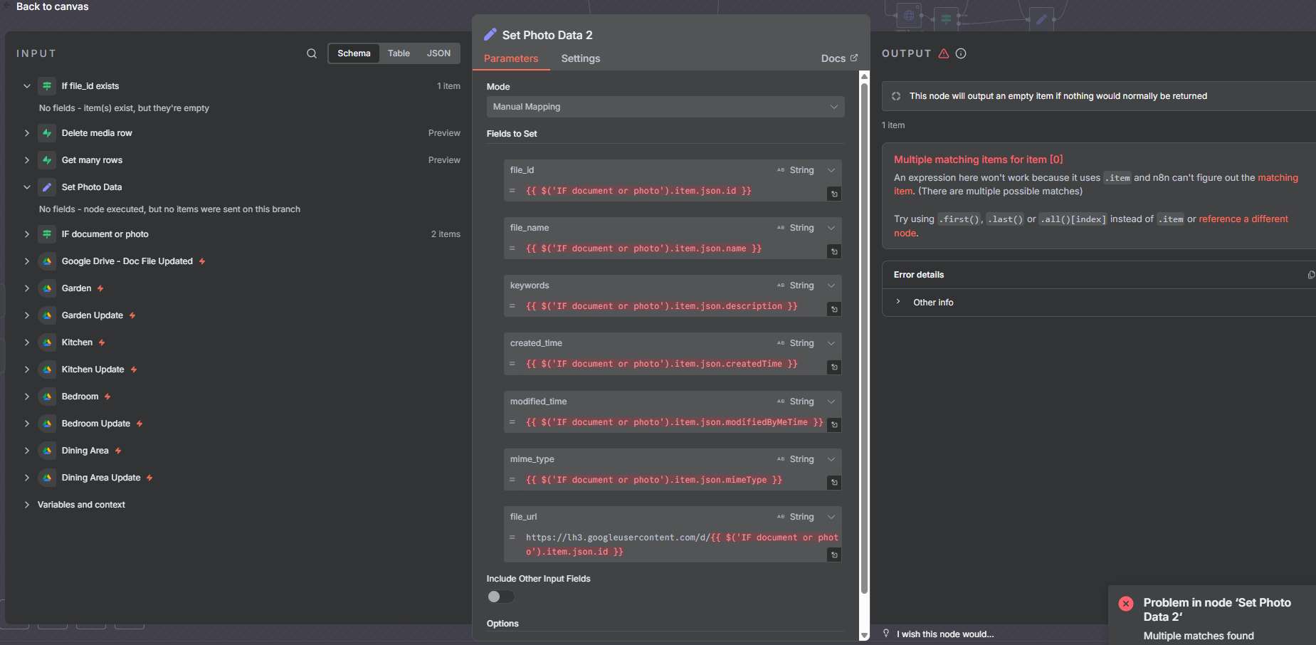 This error happens because you are referencing the output of a node, which contained multiple items. The IF node output 2 items, and in the Set Photo Data you say - grab this value from the output item of the IF node. The error explains that you can choose first or last or one with a specific numerical index, but you cannot reference just some item.