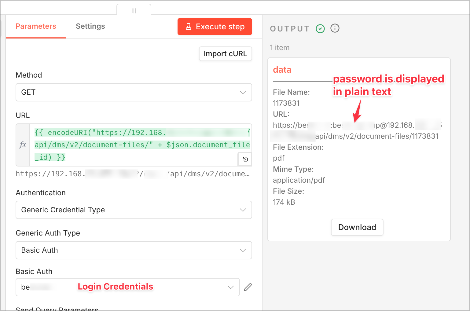 Hi, i’m using the HTTP Request node to retrieve a PDF file from an API using Basic Authentication. In the Output tab, the API password is displayed in plain text under Item Data > URL. Is there a way to mask the password?