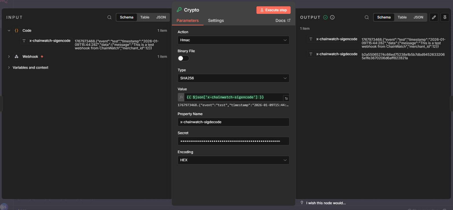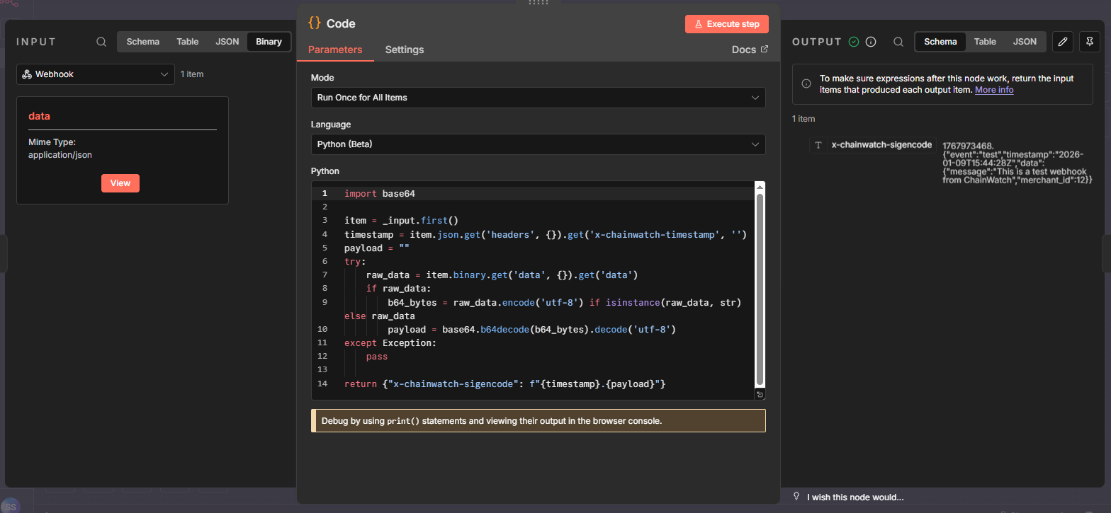 N8N doesn’t have the option to append a timestamp 1767973468 to the binary data (Raw Body Webhook) to get data in the format 1767973468.{“event”:“test”,“timestamp”:“2026-01-09T15:44:28Z”,“data”:{“message”:“This is a test webhook from ChainWatch”,“merchant_id”:12}}