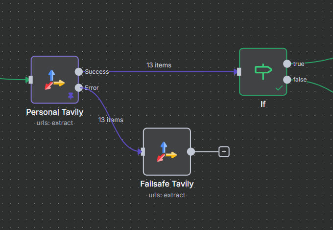 Previously I connected “Failsafe Tavily” to “If” node and when I tried to run it, “If” node waiting for “Failsafe Tavily” to give an output, I believe it behave like merge node with “waiting for all nodes to return an output”. This is where I kind confuse on where the successful output from “Failsafe Tavily” will go?