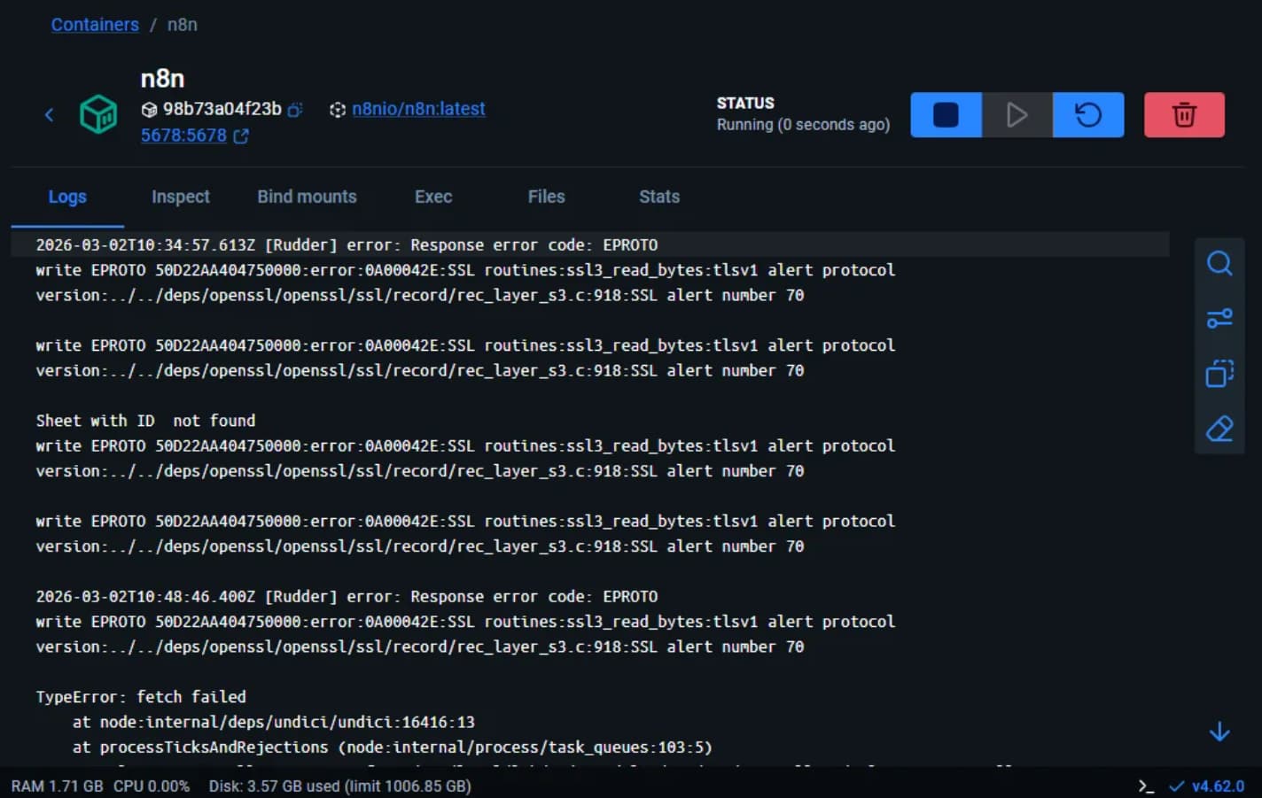 @leppu the EPROTO error you’re seeing with the Google Sheets node is a TLS/SSL protocol error, typically caused by network or certificate issues in your Docker environment.