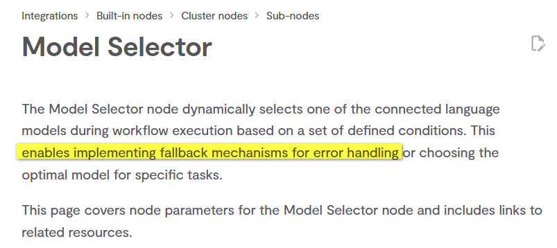 There is a new Model Selector node. Documentation says it “enables implementing fallback mechanisms for error handling“.