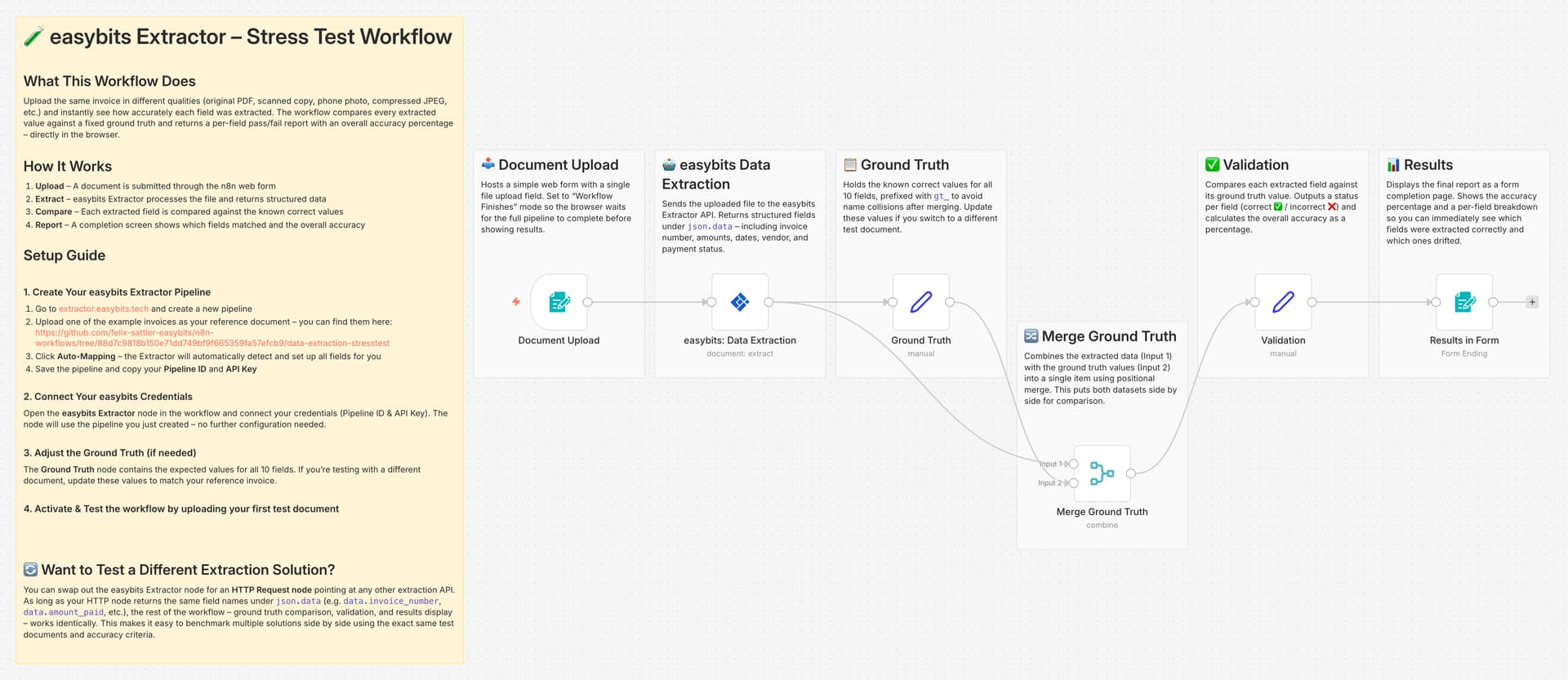 The workflow is designed to be solution-agnostic. You can swap out the easybits Extractor node for an HTTP Request node pointing at any other extraction API. As long as your response returns the same field names under json.data, the entire validation chain – ground truth comparison, per-field flagging, accuracy percentage, results page – works identically. So if you’re evaluating multiple tools, you can benchmark them all using the exact same workflow and test documents.