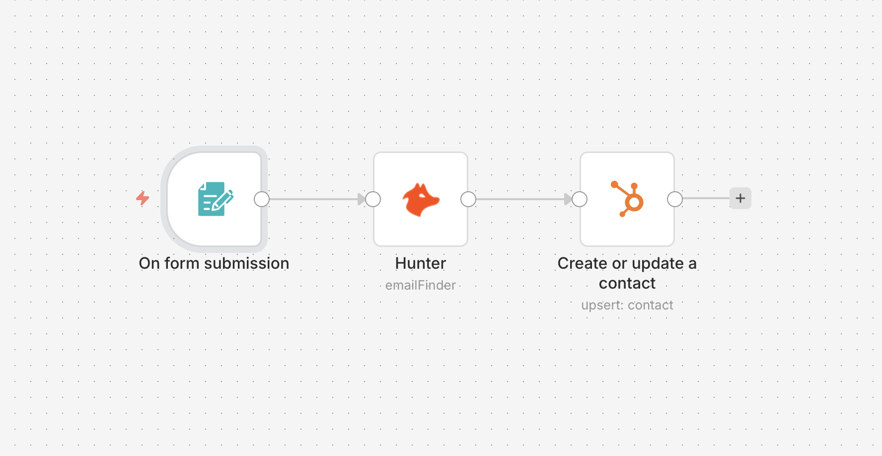 **Hunter.io node** — looks up the lead’s email address using their name and company from the form