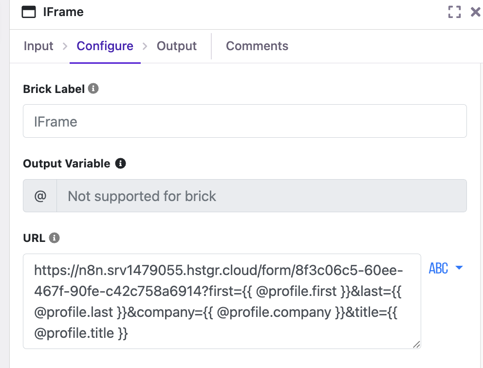 In the Render Document brick, find the iframe source URL field and paste in your n8n form URL from Step 1.