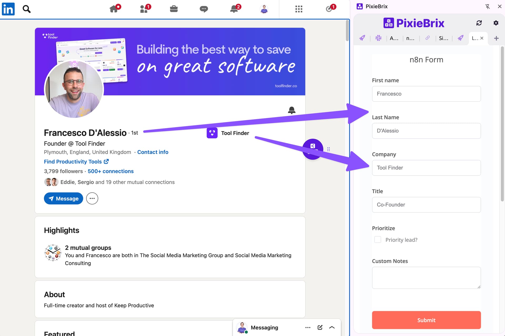 PixieBrix — free Chrome extension, installs in 2 minutes. Think of it as the missing browser UI layer for your n8n workflows.