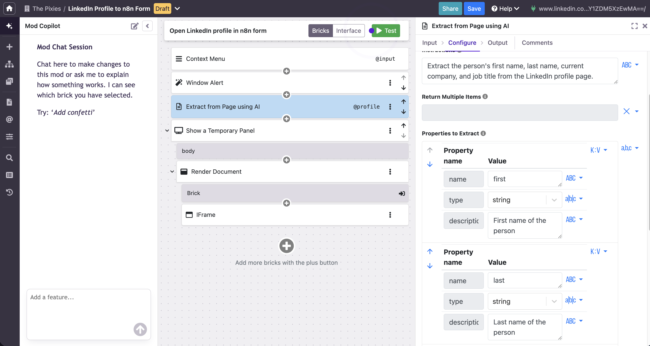 “A context menu that uses AI to find [PROPERTIES YOU WANT TO GET LIKE FIRST NAME, LAST NAME, COMPANY, ETC] on a LinkedIn profile page, then builds a URL with an n8n form and query params with those profile details, and opens a sidebar with that URL in an iframe brick.”