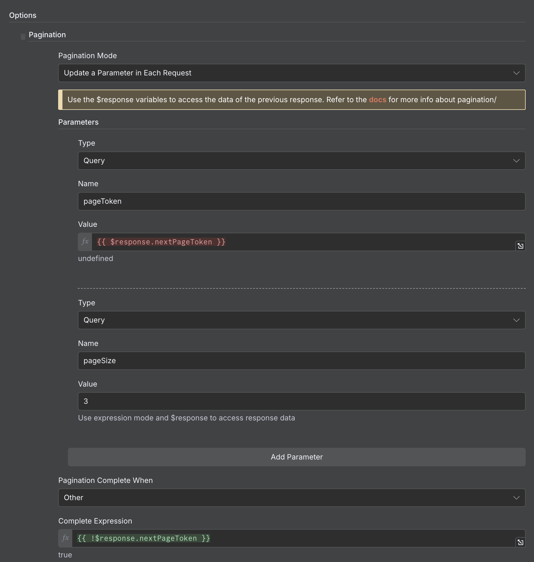 Code node just appends new data to rows (well, along with copying previous content of rows whatever it is) and bypasses nextPageToken. Note the Code node mode is set to Once for each item. There will be only item in the output from Merge but this makes the code cleaner with no need to decompose and traverse $input.all.