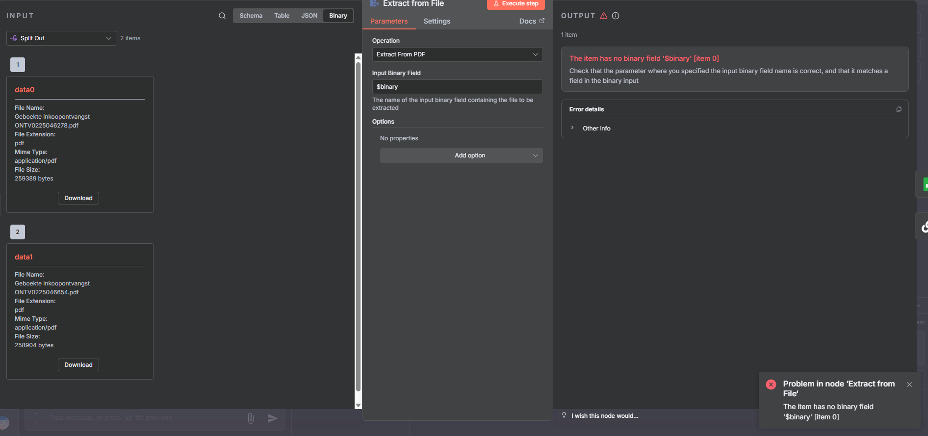 I am sending pdf files through the chat trigger to extract relevant information from it. I dont know how to handle the “extract file” node if I want to pass multiple items through it (in this case: data0, data1).