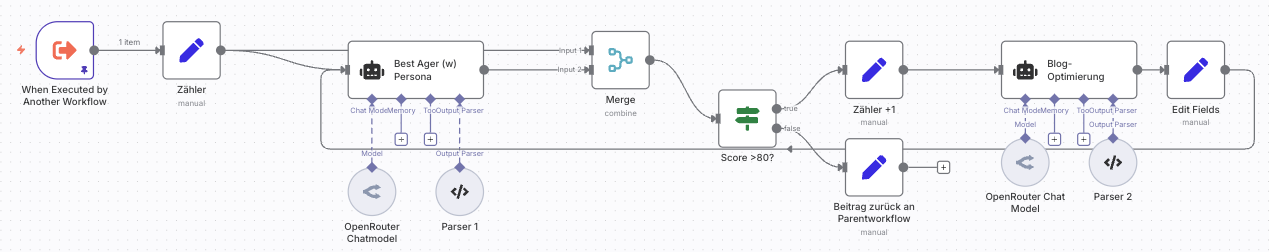 Then, the post is evaluated by another AI Agent (persona) and if needed, optimized by a third AI Agent (Blog Optimierer)
