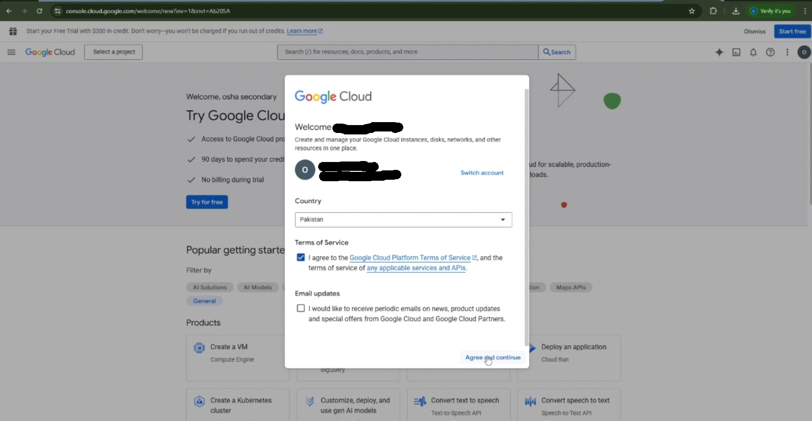 - A window may appear, asking to check the box of Section: “Terms of Service”, check that box, Click button “Agree and Continue”