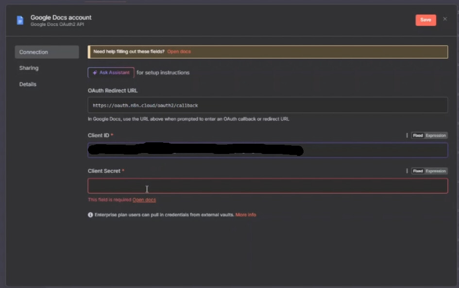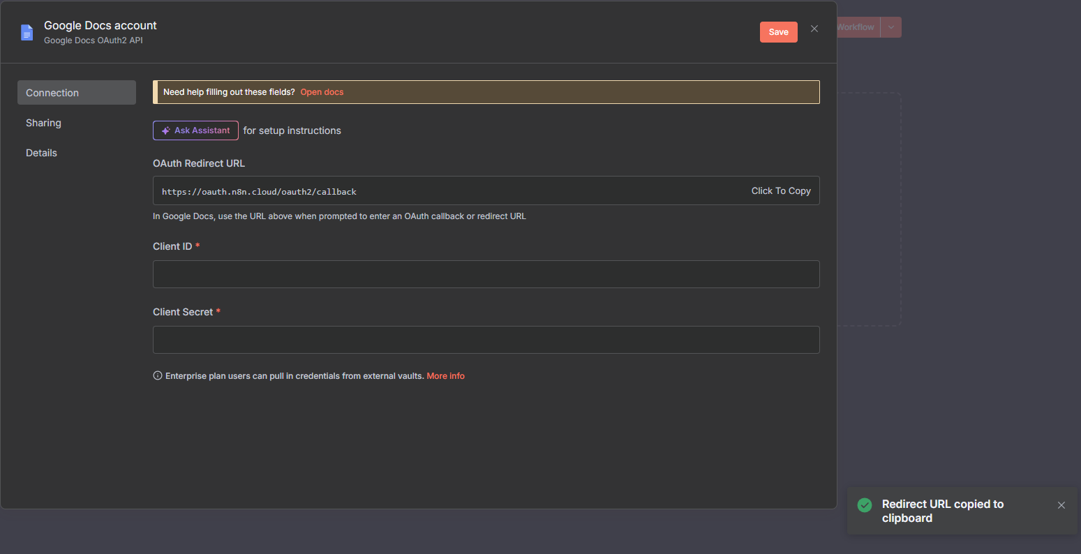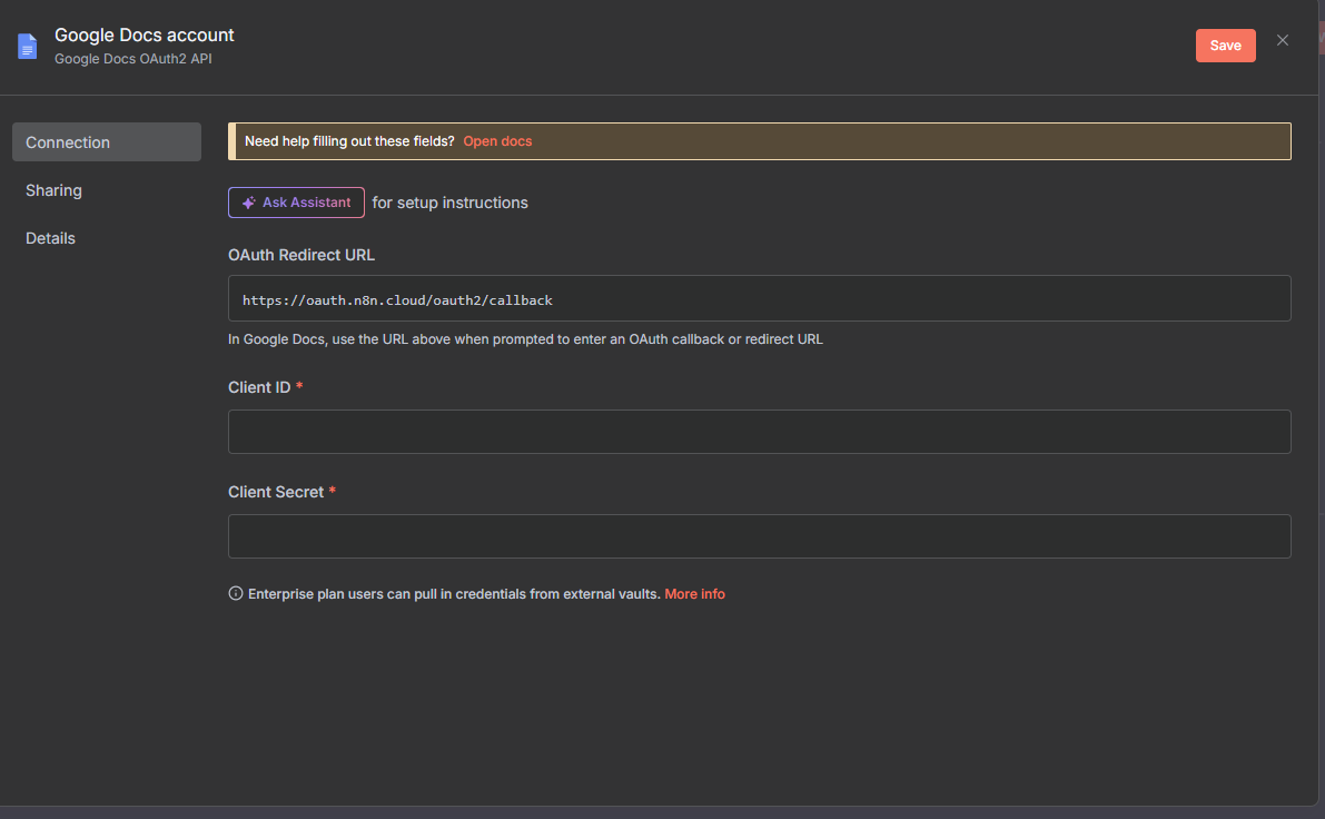 This way you will create the credentials for the GOOGLE Docs account, now you can use them in GOOGLE DOCS node and it will not throw any error.
