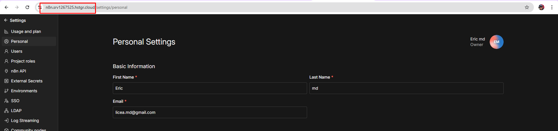 Hi @Shohag_Rana1 Let me clarify again, you are NOT using n8n cloud , you are using Hostinger Self hosted n8n and there is no such subdomain there, and your username can be viewed in the personal settings as you can see in the second screenshot which is Eric md.