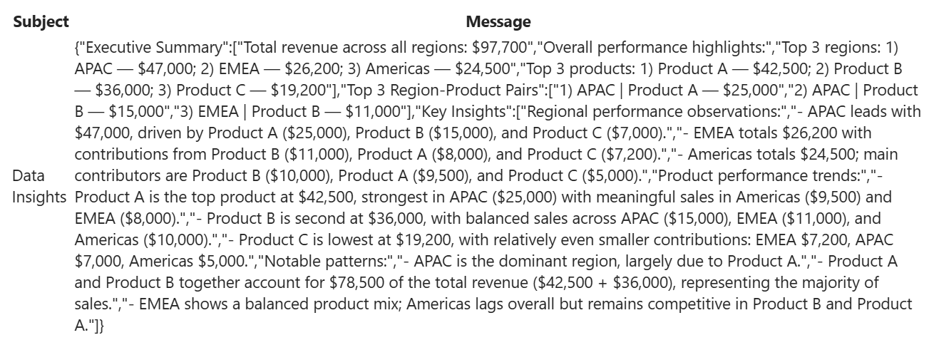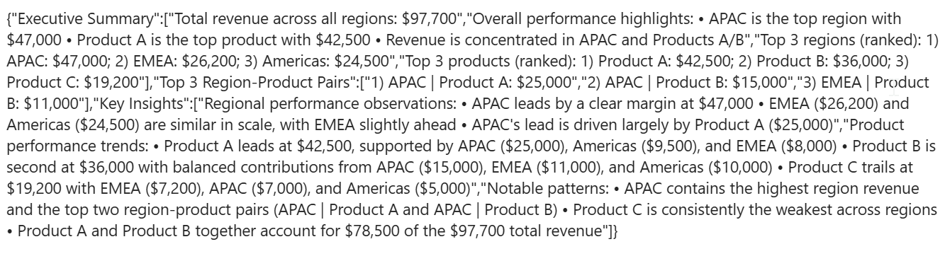 | Executive Summary | 0:Total revenue across all regions: $97,700 | 1:Overall performance highlights: | 2:- Top 3 regions: | 3: 1. APAC — $47,000 | 4: 2. EMEA — $26,200 | 5: 3. Americas — $24,500 | 6:- Top 3 products: | 7: 1. Product A — $42,500 | 8: 2. Product B — $36,000 | 9: 3. Product C — $19,200 | Top 3 Region-Product Pairs | 0:Ranked Top 3 Region-Product Pairs: | 1:- 1. APAC | Product A — $25,000 | 2:- 2. APAC | Product B — $15,000 | 3:- 3. EMEA | Product B — $11,000 | Key Insights | 0:Regional performance observations: | 1:- APAC leads with $47,000 (≈48.11% of total), driven primarily by Product A ($25,000) and Product B ($15,000). | 2:- EMEA totals $26,200 (≈26.82% of total), with relatively balanced contributions from Product B ($11,000), Product A ($8,000), and Product C ($7,200). | 3:- Americas totals $24,500 (≈25.07% of total), where Product B ($10,000) and Product A ($9,500) are the main contributors. | 4:Product performance trends: | 5:- Product A is the top product at $42,500 (≈43.53% of total), led by APAC ($25,000) and solid contributions from Americas ($9,500) and EMEA ($8,000). | 6:- Product B is second at $36,000 (≈36.83% of total), with meaningful sales across APAC ($15,000), EMEA ($11,000), and Americas ($10,000). | 7:- Product C is the smallest at $19,200 (≈19.64% of total), with EMEA ($7,200) and APAC ($7,000) contributing most of its revenue. | 8:Notable patterns: | 9:- APAC is the dominant region, accounting for nearly half of total revenue, driven mainly by Product A. | 10:- Product A and Product B together represent the majority of revenue ($78,500 of $97,700). | 11:- EMEA and Americas have comparable total revenue (EMEA $26,200 vs Americas $24,500), while APAC is a clear outlier at $47,000. | |