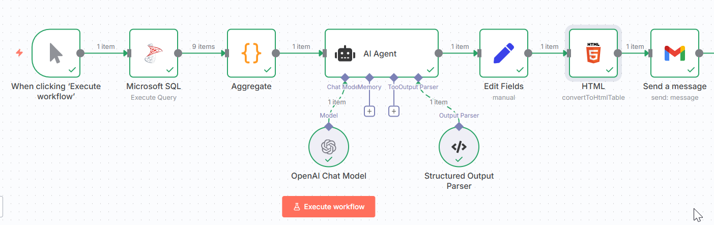 "jsCode": "// Aggregate all rows into one item for the AI\nconst allData = items.map(item => {\n return {\n Region: item.json.Region,\n Product: item.json.Product, \n TotalRevenue: item.json.TotalRevenue\n };\n});\n\nreturn [{\n json: {\n completeDataset: allData,\n totalRecords: allData.length,\n datasetText: allData.map(row => `${row.Region} | ${row.Product} | ${row.TotalRevenue}`).join('\\n')\n }\n}];"
