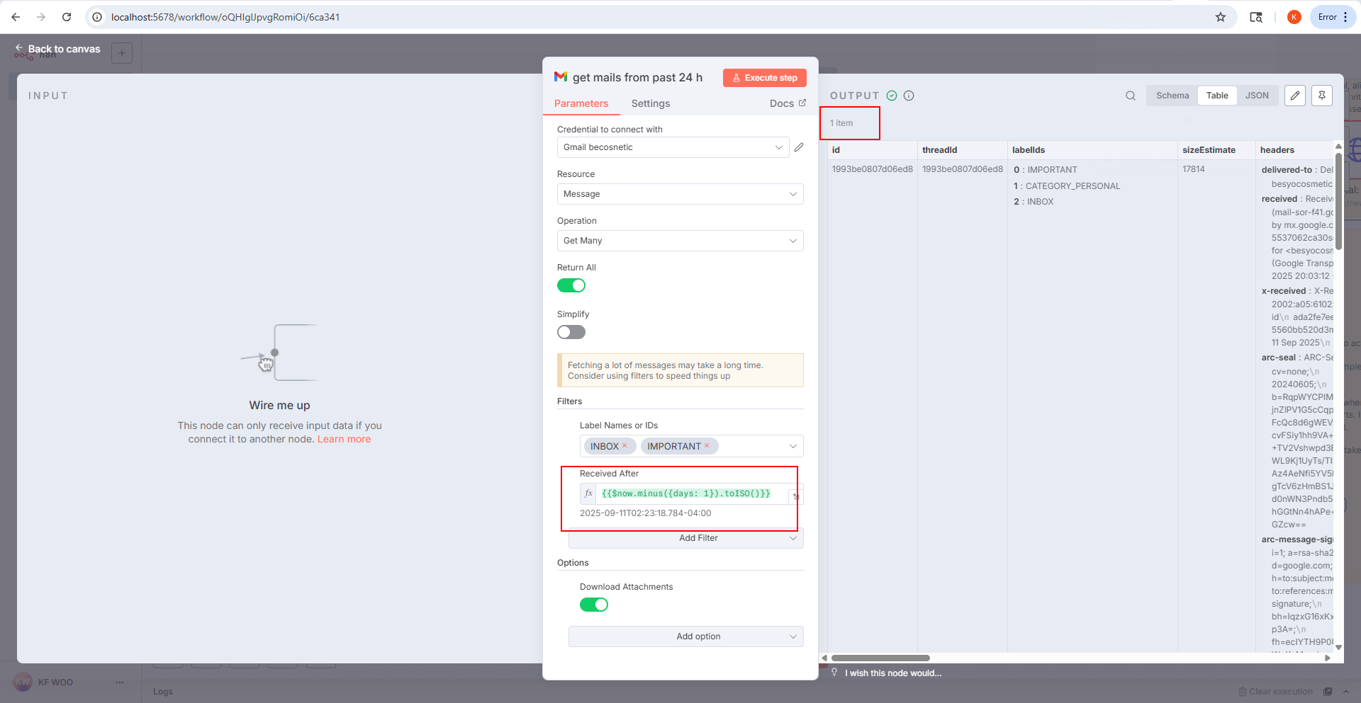 I’m trying to build an n8n workflow to retrieve all my Gmail messages from today, including: