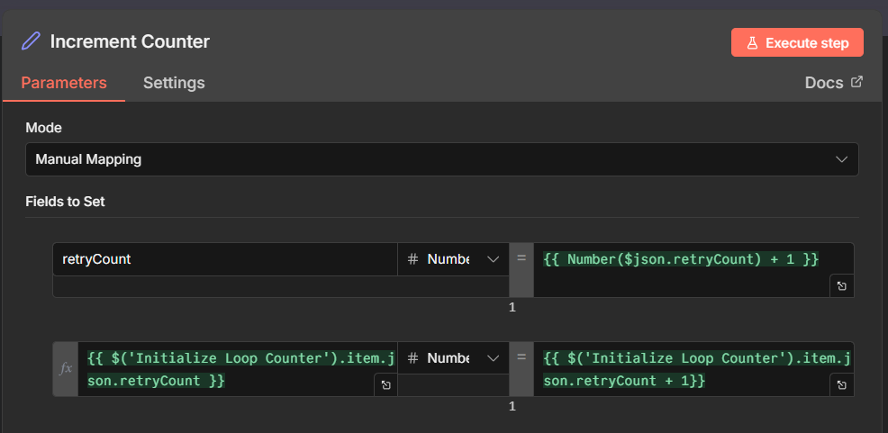 Und some conditions I wannt to iterate the loop once again at a maximum of 5 times. So I increment the counter. But on the beginning of the loop, the input variable “retryCount” is still “0” and has no change.