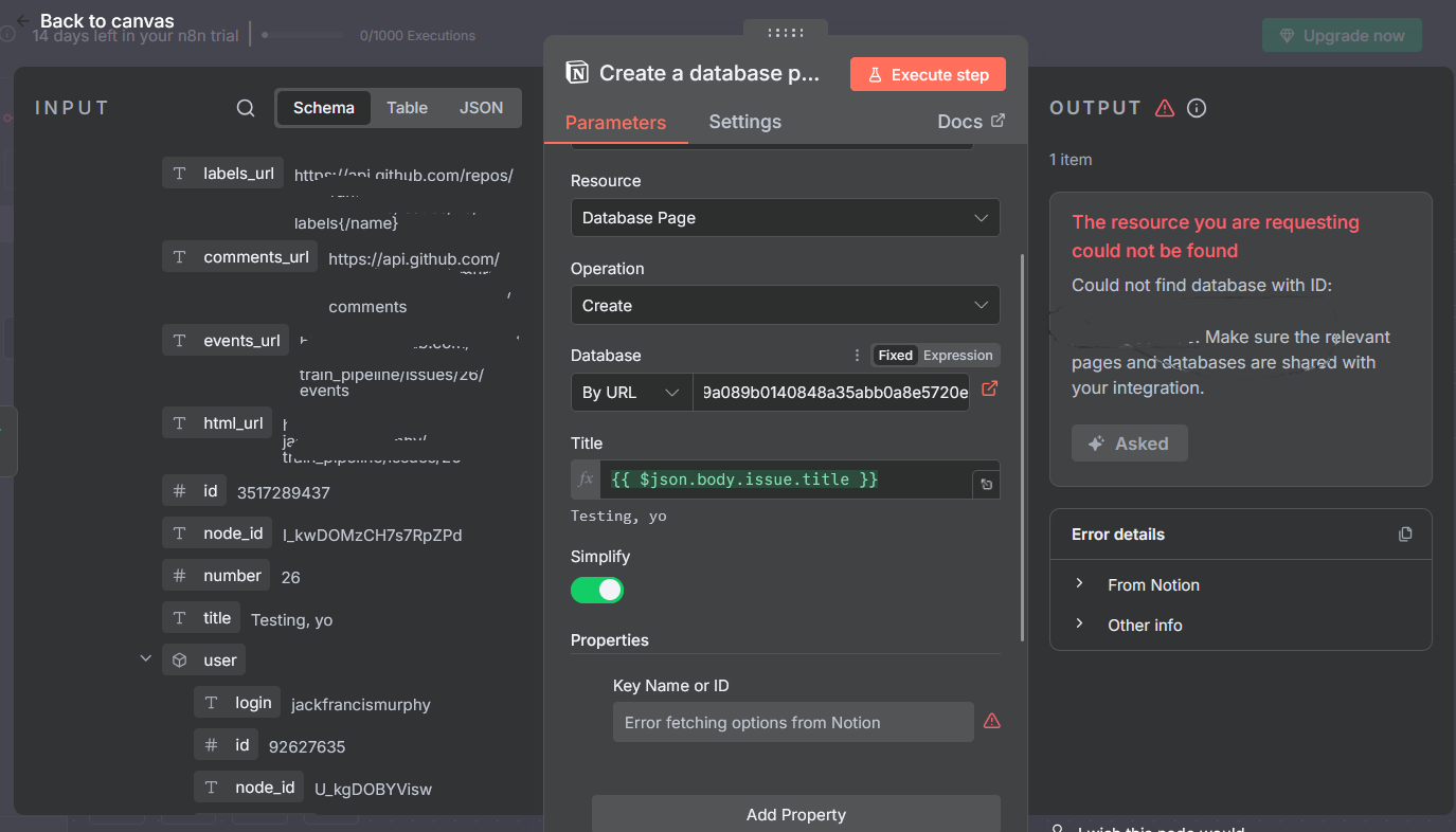 In terms of editing the ‘properties’ parameters, the “Key Name or ID” field cannot fetch the options from Notion.