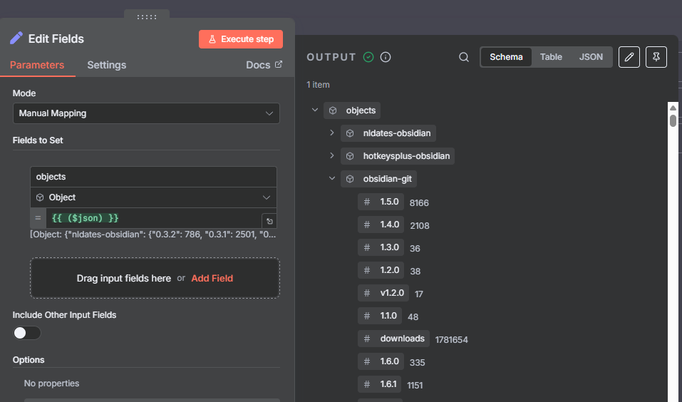 Below I have pasted an HTTP node that gets a JSON from a website. What I want to do is process it like a list with a Loop node, iterating each object in the list. The list contains objects, which are the names of softwares I am tracking, and each object contains multiple versions, and a date field called “updated”. What I want to do is go through each one, get the name of it and the updated date, and then after that I will run those through a Compare node to another set of data. I can take it from there. But the trouble I am having is converting this JSON set of objects into an iterate-able list that a Loop node will process properly.