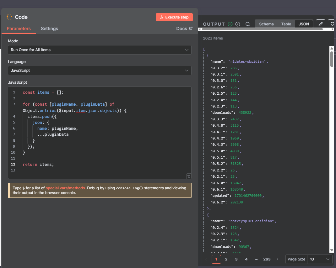 “jsCode”: “const outputItems = ;\n\nfor (const item of $input.all()) {\n try {\n const parsedData = JSON.parse(item.json.data);\n \n for (const [pluginName, pluginData] of Object.entries(parsedData)) {\n const pluginObject = {\n name: pluginName,\n totalDownloads: pluginData.downloads || 0,\n lastUpdated: pluginData.updated || null,\n versions: {}\n };\n \n for (const [key, value] of Object.entries(pluginData)) {\n if (key !== ‘downloads’ && key !== ‘updated’) {\n pluginObject.versions[key] = value;\n }\n }\n \n outputItems.push({ json: pluginObject });\n }\n \n } catch (error) {\n outputItems.push({\n json: {\n error: `Failed to parse JSON: ${error.message}`,\n originalData: item.json.data\n }\n });\n }\n}\n\nreturn outputItems;”