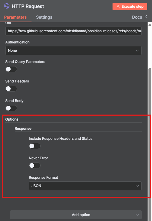 First, in the HTTP node, go to Options > Response and set the Response Format to JSON: