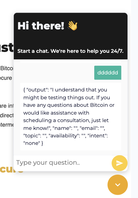 “content”: “{\n \“output\”: \“I understand that you might be testing things out. If you have any questions about Bitcoin or would like assistance with scheduling a consultation, just let me know!\”,\n \“name\”: \”\“,\n \“email\”: \”\“,\n \“topic\”: \”\“,\n \“availability\”: \”\“,\n \“intent\”: \“none\”\n}”,