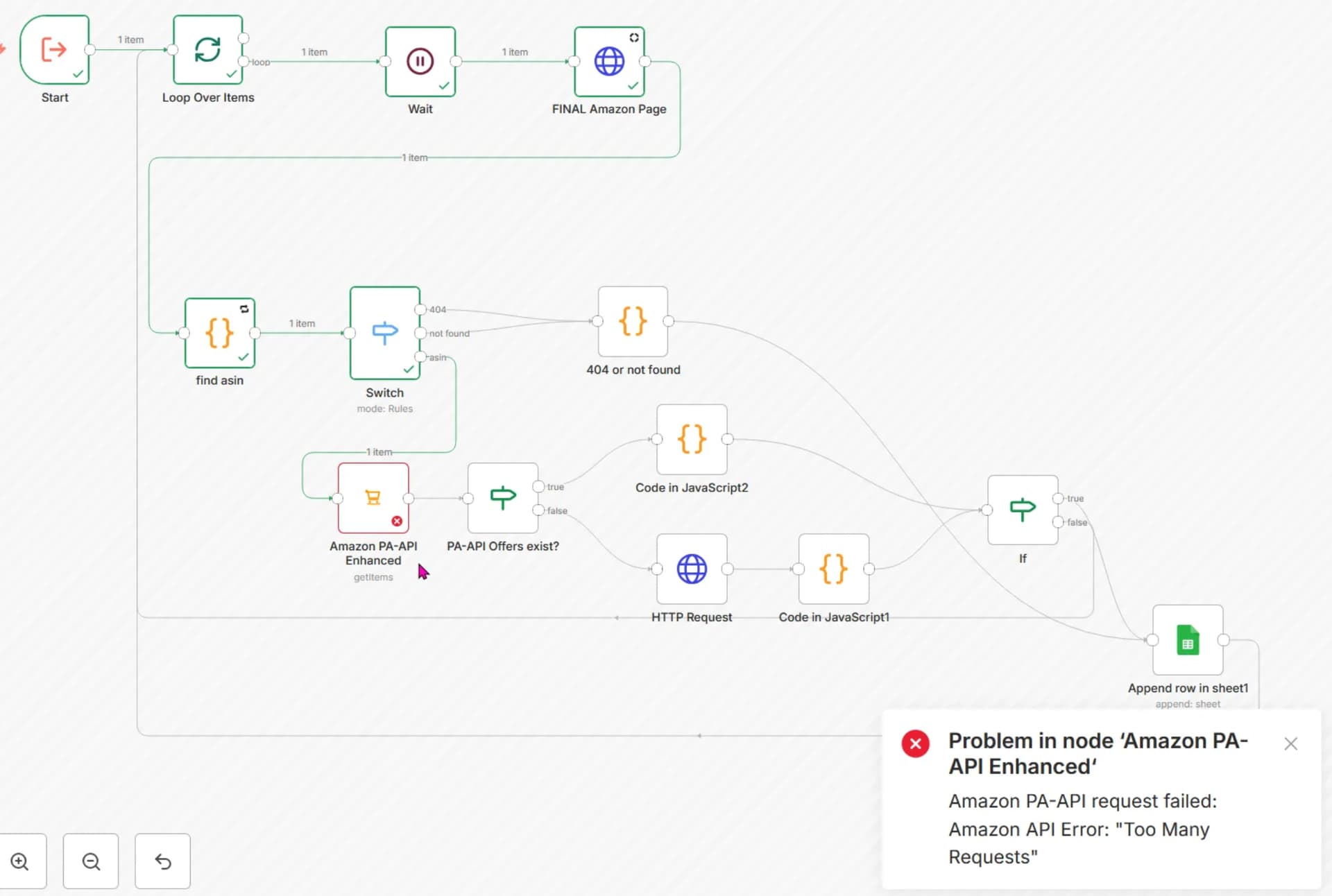 The Wait node isn’t doing what you think it is here, n8n sends all items through a node in parallel by default so your API calls are all firing at once regardless of the Wait. Amazon PA-API only allows 1 request per second with fresh credentials so you’re getting hammered immediately. What you want is to use the Loop Over Items node with batch size set to 1 right before the PA-API node, and then put your Wait node after it looping back, that way it processes one item at a time with a delay between each. Alternatively if you’re using the HTTP Request node directly you can go into Options > Batching and set items per batch to 1 with a batch interval of at least 1000ms which does the same thing without needing the loop.