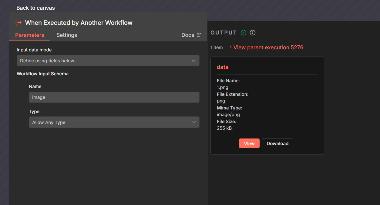 I understand the key is that if I want to pass binary to subworkflow. the node that output binary must directly connect with “Call subworkflow“ node