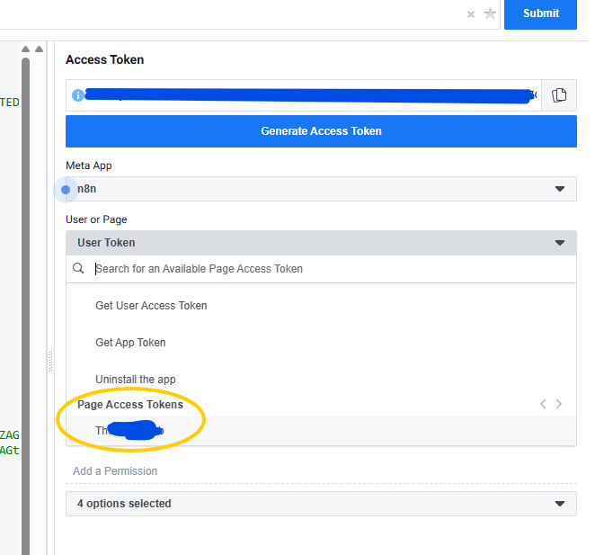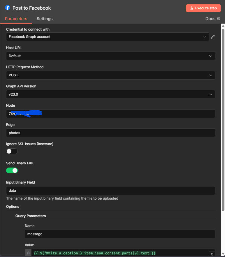 Next, I take the access_token for the Page that I want to post to and I use that access_token in the n8n. Now, I’m able to post to my Facebook page using n8n with the following settings: