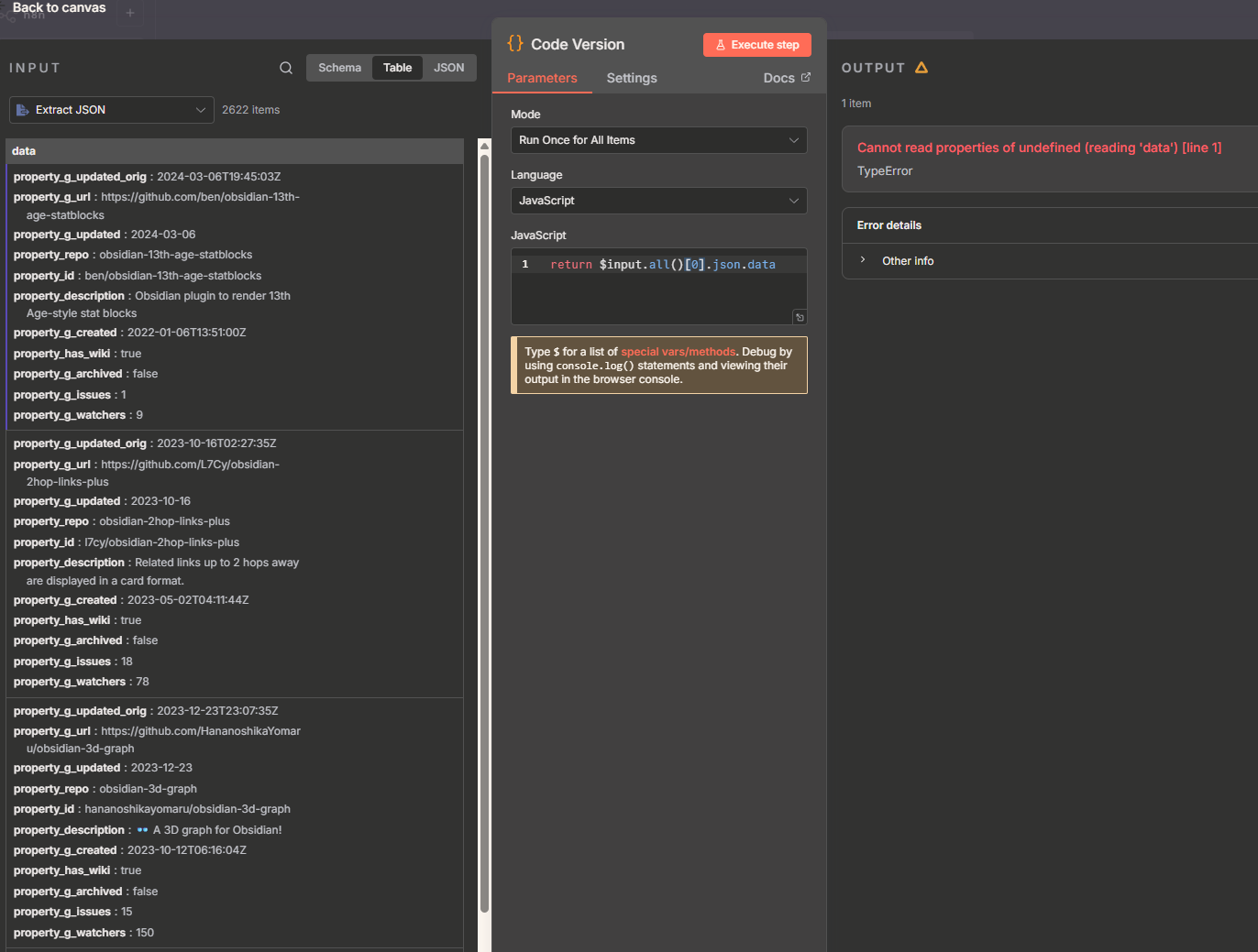 Interested to try the Code node, but it gives me an error in my workflow. I think the included [0] needs to be removed? Here’s a screenshot of what I see. Note, the workflow I shared in this post is just a slice, the screenshot below is with the full dataset.
