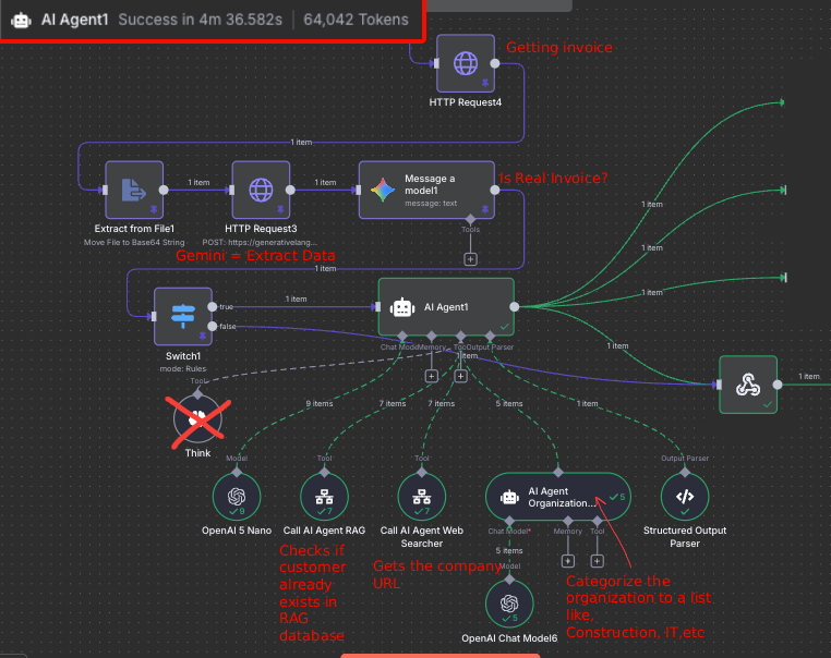 The process works as follows: The invoice is retrieved from our database, converted into Base64, and sent to Gemini 2.5 Flash for a quick validation check to determine whether it’s a genuine invoice. The result is then passed on to AI Agent1, whose task is to extract the remaining details and produce the output in JSON format.