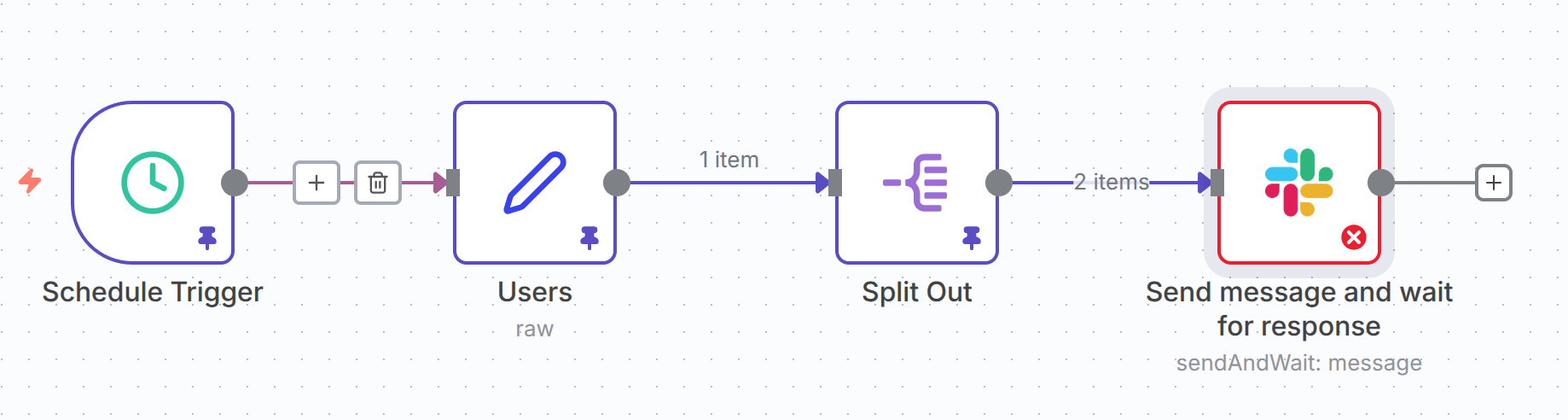 I created a Set Node with a list of slack user ids, then connected it to a Split Out Node and then to a Slack Send a message and wait for response but this last node is only executed for the first input item.