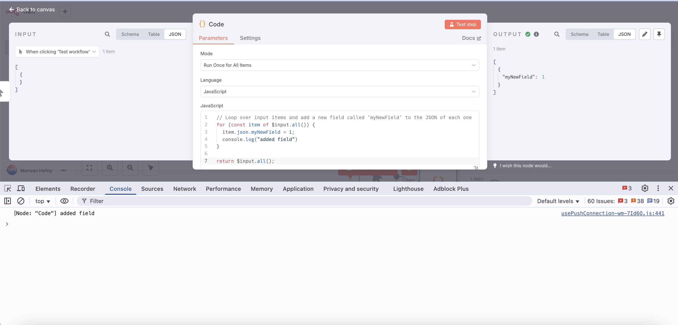 "jsCode": "// Loop over input items and add a new field called 'myNewField' to the JSON of each one\nfor (const item of $input.all()) {\n item.json.myNewField = 1;\n console.log(\"added field\")\n}\n\nreturn $input.all();"