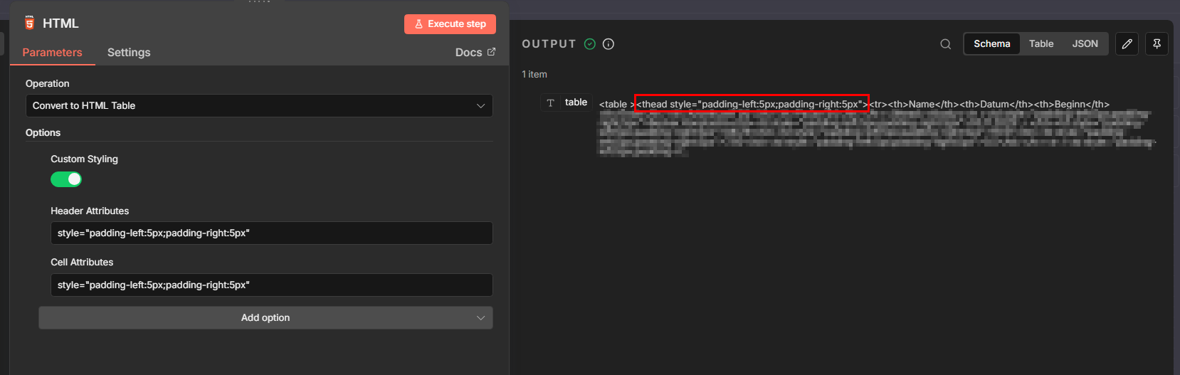 In contrast, the Cell and Row styling options for regular table rows in n8n allow per-cell granularity — I can apply padding to each <td> and get proper spacing between cells. For the header row this is currently not possible, since padding applied via <thead> does not behave the same as padding on individual <th> elements.