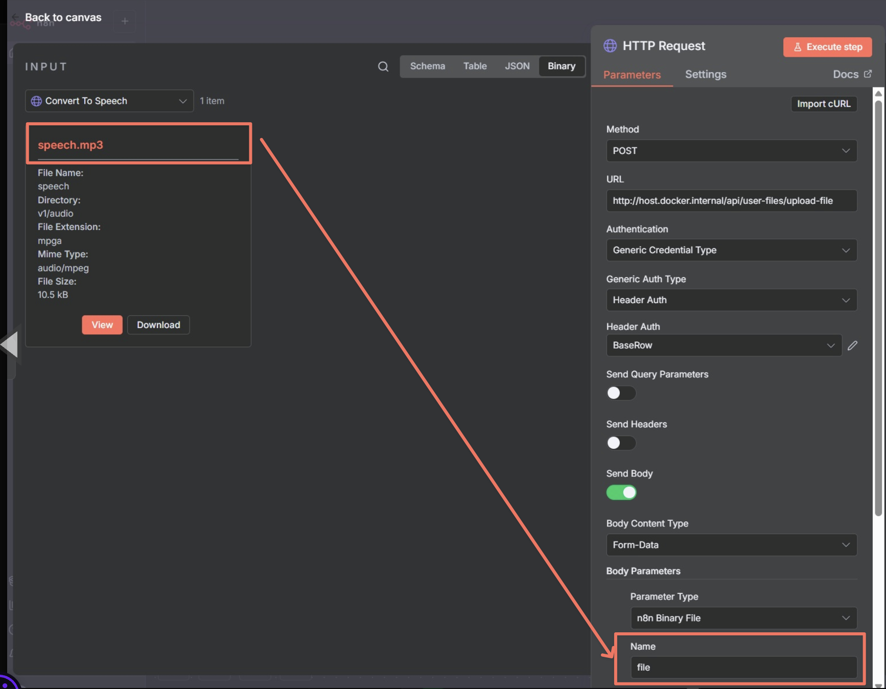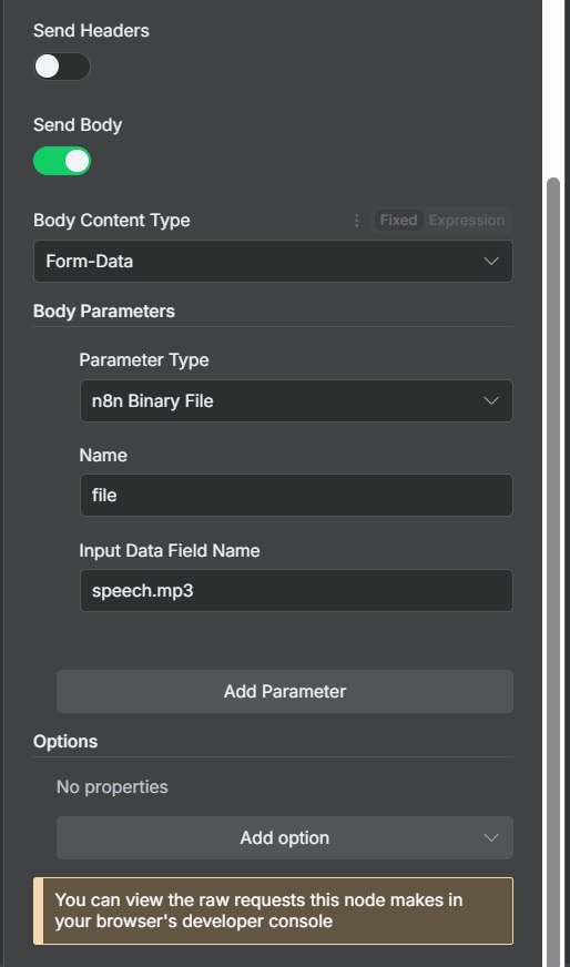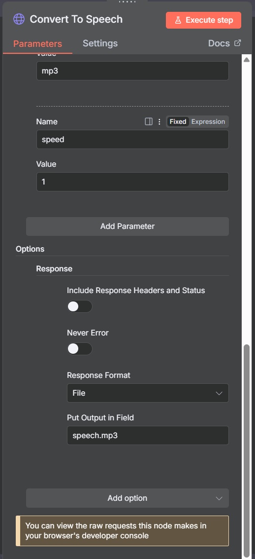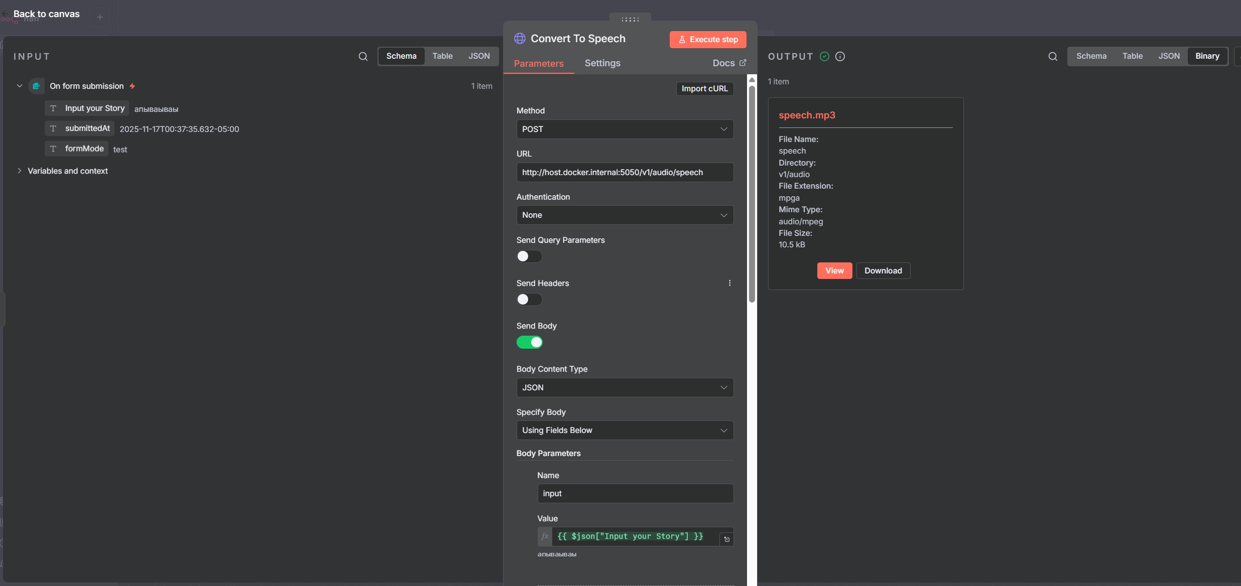 My workflow is as follows: I enter text manually, creating a “on form submisson” for this. Then it sends it to HTTP for conversion to audio (mp3). TTS Edge converte it, and there are no problems at this stage. I now have my mp3 file, and I can listen to and download it.