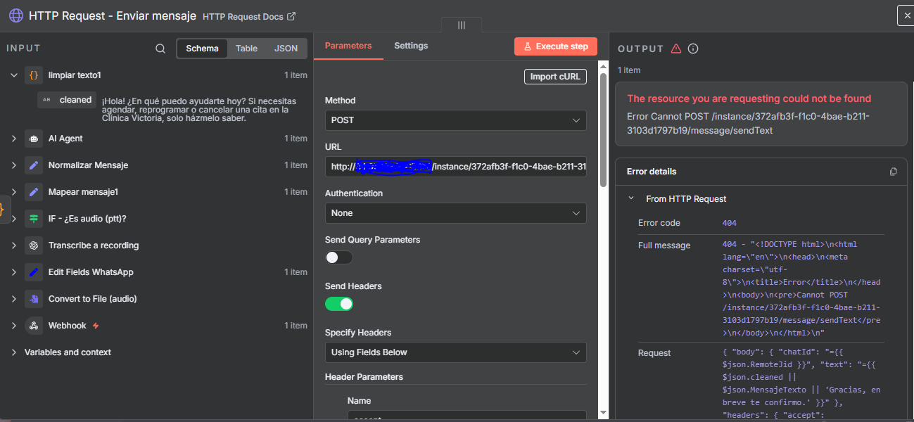 I am trying to send a request through an HTTP Request node in n8n to interact with Evolution API. However, the node fails with a 404 error saying the requested resource could not be found.