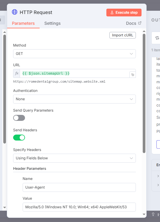 And this is my HTTP Request node. I added the user agent to try to overcome this issue: