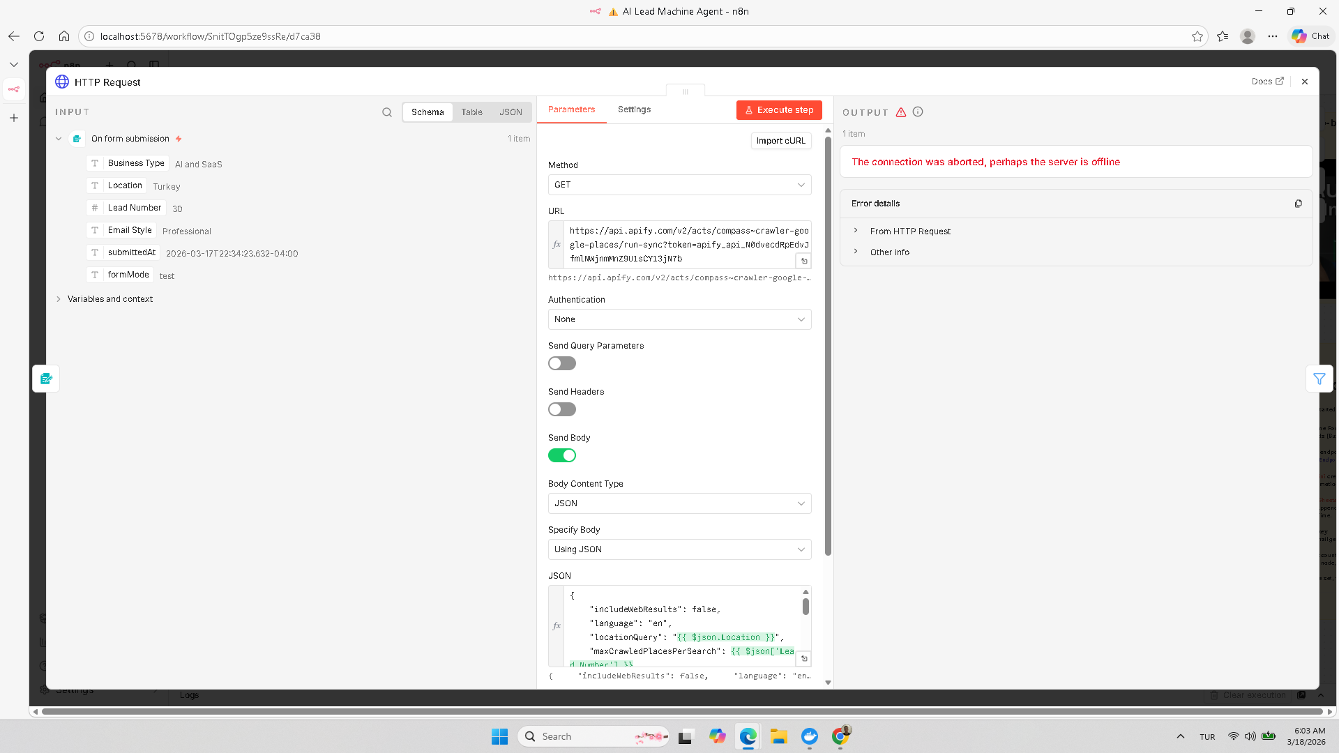 One of the workflows that I am using for lead generation ,the HTTP Request node gives me an error like this: “Connection was aborted, perhaps the server is offline”. What is the solution for this ?