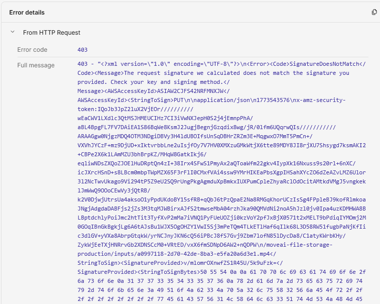 @NeonMind the data being larger means that the encoding is base64 so lets try setting encoding: 'arraybuffer' , i think AWS needs a content-type header and that is why it acting this way adding that back might help. Try using this one: